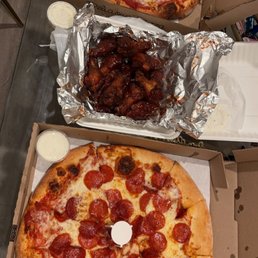 My go to order is medium pizza 2 toppings and 6 wings, feeds my family of 3. The girl in front is super friendly. We just discovered this place and it's our go to.